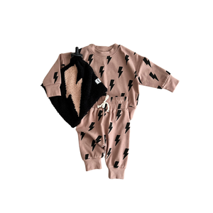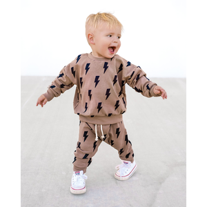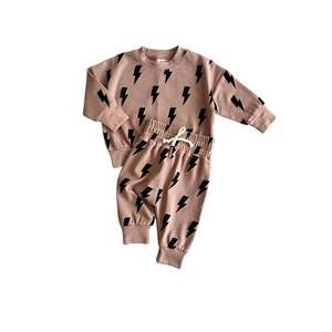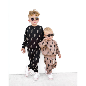 This playful two-piece jogger set features bold bolt graphics and is made from a premium blend of 95% cotton and 5% spandex for a soft, flexible feel. The set includes a long sleeve top with a relaxed fit and pants with an elastic waistband and cuffed ankles for comfort and easy movement. Designed to be gender neutral and suitable for daily wear, this set is perfect for lounging, play, or outings.