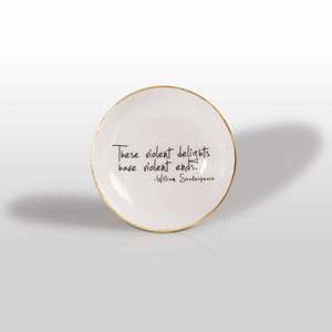 These Violent Delights Have Violent Ends Shakespeare A collectsion of serveware and objects featuring quotes with a sophisticated vibe. Hand crafted and artisan made, each piece is designed in our San Francisco studio. Master craftsmen use centuries-old sand casting techniques to create the original mould, and skilled artisans handcraft every piece in our family-owned foundry. Details: Dimensions: 2"H x 8.75" DIA Finish: Gold, Oyster, Black Material: Aluminum, Enamel, Decoupage Use and Care: - Given its handmade and hand-finished nature, variations in the piece are to be expected. - No two pieces are exactly alike. - Food safe - Hand wash with mild soap, water, and towel dry. - Do not use abrasives or chemicals to clean the metal as it may scratch and discolor. - Not dishwasher safe - Will not tarnish.
