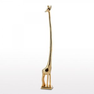The Modern Fauna Collection by Lunares celebrates the most identifiable characteristics of each animal in a sculptural, modernist style. This elegant giraffe sculpture features an extra long neck, making it a whimsical addition to bookshelves or a unique jewelry display for bracelets. Each piece is designed in the San Francisco studio and handcrafted by master craftsmen using centuries-old sand casting techniques. Skilled artisans hand create every piece in a family-owned factory. Dimensions: 25.5" H; 3.5" L; 2.25" W Finish: Gold Material: Aluminum