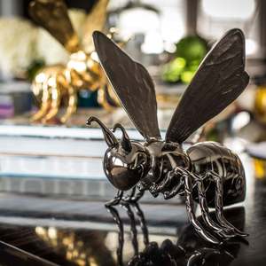 The Queen Bee Gold Sculpture by Lunares is a hand-crafted, gold-plated accent piece made from aluminum. Its modern design adds sophistication and whimsy to any space. Each piece is handmade and hand-finished, so variations are to be expected and celebrated. No two pieces are exactly alike. Details: - Dimensions: 8.7" H; 10.75" L; 9.5" W - Finish: Gold - Material: Aluminum Care Instructions: - Hand wash with mild soap, water, and towel dry. - Do not use abrasives or chemicals to clean the metal as it may scratch and discolor. - Will not tarnish.