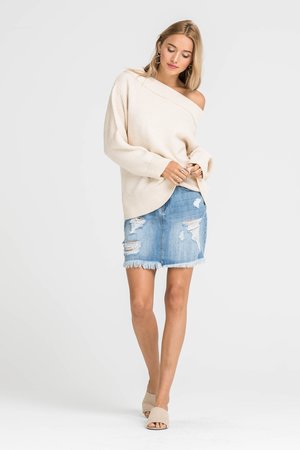Cream colored oversized sweater that sits off the shoulder. Features a wide-band collar.
