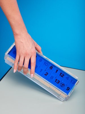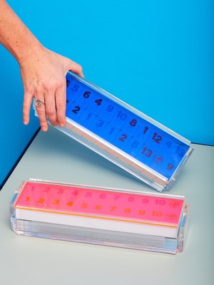 New El Rumi rummy tile game by Luxe Dominoes. Beautiful set of game tiles come in a hand bent acrylic box with sliding transparent colored lid. Comes with 4 racks, full game, and box. Perfect for play and display. 2.5" H x 12.5" W x 3.8" D -- NOTES-- We love playing this game and this set is so beautiful we can't wait to gift this to our favorite people!