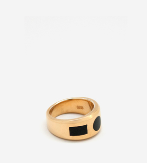 18K gold plated sterling silver inlay ring with Black Onyx. Available in Silver. An elegant everyday piece with a masculine and feminine approach, perfect on it's own and also as a pinky ring. Polished 18K plated over Sterling Silver Each stone are unique & vary in color Measures 9.70mm Face X 1.45 mm X 5.55mm band. Made in New York City This piece is handcrafted, please allow 5-10 business days for delivery.