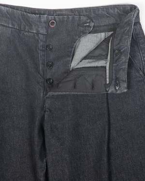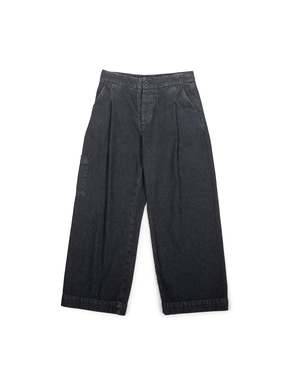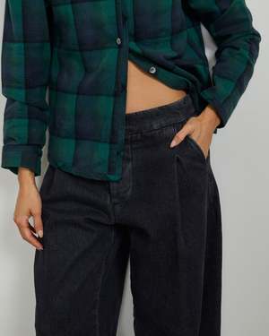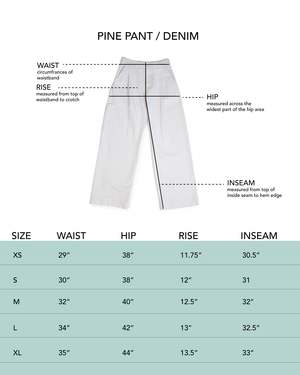 Utility with refined details. Two front pleats shape the silhouette with a generous leg and a break so you can wear it over a slim shoe or your favorite boots. Features an under tab extension inspired by men's tailoring, with clean, contrast poplin in the pockets and inner waistband. The Pine Pant is cut from solid 100% cotton black yarn-dyed 14 oz denim, stonewashed for broken-in softness. Cotton poplin detailing for pockets and inside finish. Button-fly made with natural Corozo nut buttons. Made in Los Angeles. 30 inseam. Minji is 5'7" and wears size S. Paz is 5'5" and wears size XS.