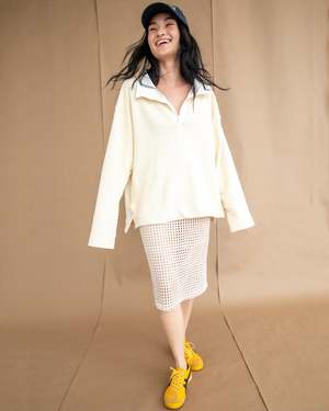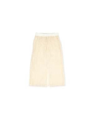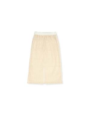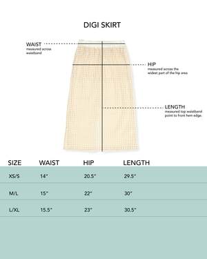 The Digi Skirt by LWN is an easy slip-on pencil skirt with an elasticated waist and a center back vent. Made from 100% cotton broidery in a grid motif and trimmed with deadstock cotton at the waistband. Iron after washing. Minji is 5'7" and wears size XS/S.