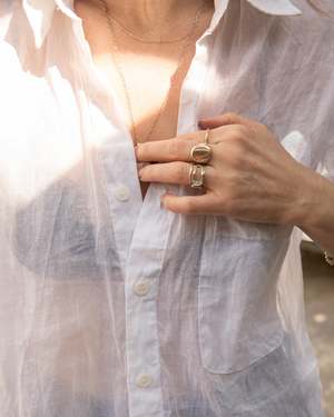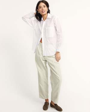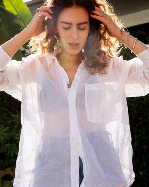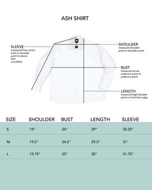 Hi there, Ash youre my new everyday shirt. Cut like a vintage 80s bankers shirt, Ash has oversized, full-sleeve, and cuff pleats. Made from a semi-sheer cotton organdy used in traditional Korean dresses. Strong yet delicate, the fabric has a fine crinkle while holding shape in the body. DETAILS 100% Cotton organdy. Made from deadstock, locally in LA. Natural Crozo buttons. FIT Gabby is 5'10 and wears a size M.