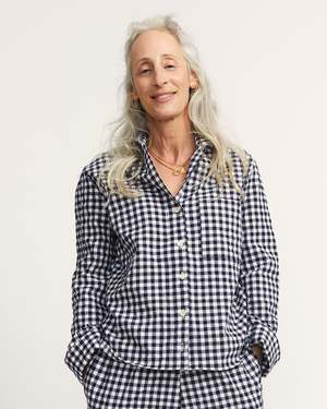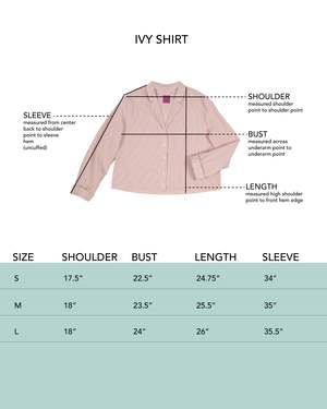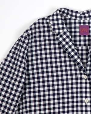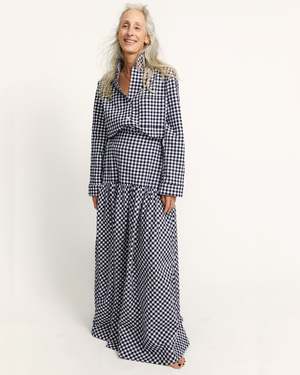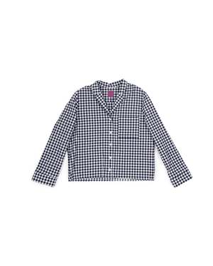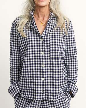 Boxy and light, Ivy is an elevated take on the classic pajama shirt. A single breast pocket, notched collar, center front buttons, and sleeves that end in a banded cuff finish. This has a similar silhouette to our Cedar dress, with a break that lands just at the right point of the bust line. Ivy in Japanese Seersucker Gingham has a bold check pattern in deep blue, and the great drape and feel of seersucker. Pair it with our matching Talis skirt or Strausii Pants to finish the look. 100% cotton Japanese Seersucker Gingham. Made in LA. This style is boxy and meant to be loose fitting. Paz is 5'5 and wears a size M.