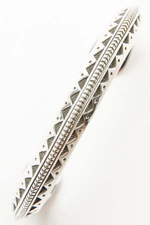 Triangle Design 0.37" Cuff Width 1.37" Opening Widest Diameter - 2.70" Sterling Silver Hand-Stamped Dine (Navajo) Made Made in USA The style that Lyle Secatero creates can be best described as handmade, stamped, traditional and contemporary, Navajo sterling silver jewelry. Lyle Secatero has been chosen "Who To Know Right Now" by Indian Market Magazine 2018.