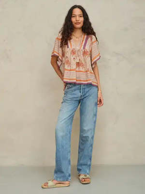 Crafted from a light silk and cotton blend, this dreamy top nods to the hazy summer days of the 70s. Style yours with vintage jeans or cut-offs. Sizing and information: true to size; the model is 5'10" and wears size S. 70% cotton, 30% silk. Made in India.