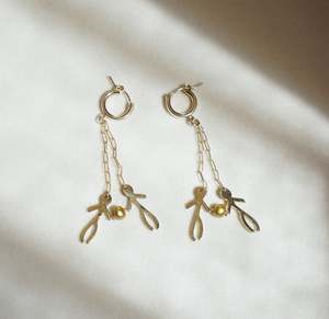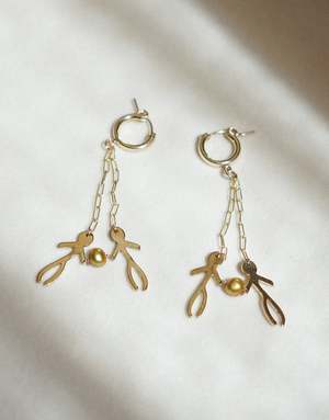 DESCRIPTION In its most popular form, the anting-anting is an indigenous Philippine amulet, believed to protect its wearer. Inspired by the cultural cues of our ancestors, these charms are an extension of the Filipino belief that everyday objects are imbued with symbols to heal, protect, strengthen, and manifest. MAAARIs Anting Anting collectsion is our version of this safeguarding talisman an homage to the ancestral spirits that guide us. The charms in this collectsion are affirmations we strive to instill in our day to day: Banga = Resilience Linglingo = Abundance Pakudos = Protection Tao Tao= Peace Sampaguita = Hope Drawing from the rich tapestries of Ilocos Surs indigenous weave known as Tao Tao, these earrings represent unity and togetherness through their hand-in-hand figure design. A heartfelt symbol of both peace and community, these earrings capture the spirit of togetherness. Made with golden dyed pearls and a gold fill paper clip chain. Charms available in high polished brass, sterling silver or gold plate. Made in small batches with limited quantities ready to ship. Please allow 1-2 weeks for your pieces to be made. SPECS 14/20 2mm gold fill or sterling silver hoop 27mm wide 70mm tall *need dimension ABOUT THE MAKERS We are proud to partner with minority/family-owned Kegulian Jewelers in downtown Los Angeles to produce our Anting-Anting charms. Kegulian uses sustainably sourced, recycled metals to cast our pieces. After casting, the pieces are hand-finished and then sent to our Maaari studio where the pieces take their final form. All pieces are made with ethically-mined metal and sustainably-sourced earth stones. TAKE CARE Brass and Silver naturally oxidizes over time and have found that we appreciate the patina. Renew your piece's shine with vinegar, water, baking soda, and a polishing cloth. To delay oxidation, keep your MAAARI jewelry away from moisture. We pride ourselves on providing high quality, hand-made jewelry. We want all of your favorite MAAARI pieces to last forever. In this spirit, we are proud to offer lifetime repairs on all MAAARI jewelry at no cost. Have a repair? E-mail us at info@maaari.co and we'll send you mailing instructions within 24 hours.