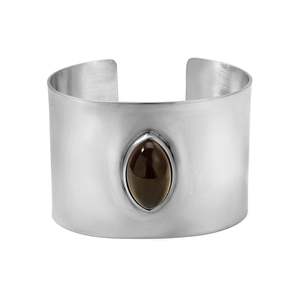 A modernist sculptural cuff bangle defined by clean angles and a geometric design. Features a bezel-set large domed natural smoky quartz gemstone. Handcrafted in Los Angeles from sterling silver .925 with a satin finish. The marquise high dome smoky quartz is cut by hand, and each piece is made by hand for a unique, artisanal touch.