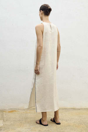 Halter high neckline in a classic sleeveless shift style with side slits. Pull-on style. Embroidery on the side seams. Maxi length shift silhouette. Perfect for summer travels. Black with white embroidery. Classic sleeveless shift style. Back keyhole closure at neckline. Made from linen fabric. Composition: 100% Linen Made in Turkey.