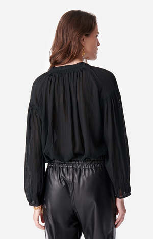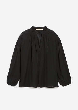 This flowing blouse plays on volumes and couture details, with light draping and feminine touches. Features: - Flowing blouse in viscose - Round neck with V-neck and button closure - Gathering detail at collar and cuffs - Long, puffed sleeves with buttoned cuffs - Loose, supple fit 55% Viscose, 45% Cotton.
