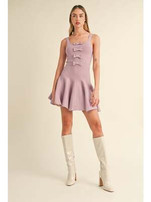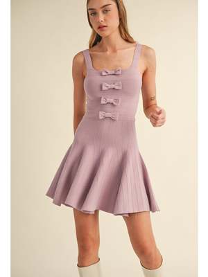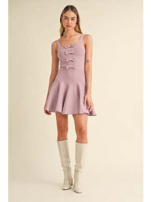Sleeveless 4 ribbon bow front detail fit and flare sweater knit mini dress. - 50%Viscose 28%Polyester 22%Nylon - Made In China