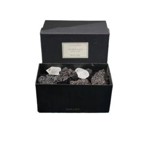Pot Pourri rocks are a stylish way to scent your home! Lava rocks with unique crystals in a blackened hand-forged iron with gold leaf applique branding. All labels are hand signed with date of production in their atelier in France. Includes a 15mg glass bottle of perfume - alcohol free All Mad et Len products are vegan, cruelty-free, handcrafted, made in France. Terre Noire scent: Primal Damp earth, Barky, Earthy, Rich Humus Soil, Mineral Note, Ancient woods of Petrified Pine, Rare Aged Oakwood, Cold Mushrooms. TO USE: Remove lid, drop three to ten drops of fragrance on stones depending upon vessel size and scent preference, set lid aside. The lid may be placed partially over the vessel to control scent projection, removed completely, or temporarily. WARNING: Avoid contact with skin. For skin contact, wash immediately with water and soap. For eye contact, flush eye with water repeatedly. Horizontal, 7x14x7 cm Made in France