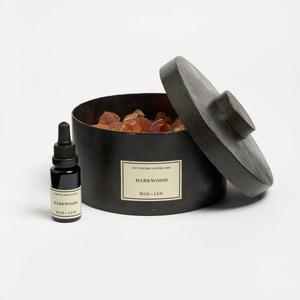 Mad et Len pot pourri comes in a hand hammered iron case with a black fum finish. All labels are hand signed with date of production in their atelier in France. Lasts forever! Vegetal Amber Rocks Includes a 15mg glass bottle of perfume - alcohol free Darkwood scent: Smoky Dark Aromatic, Leather Fougere, Ebony Notes Made in France
