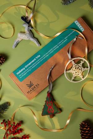 This beautiful set of three ornaments completes your holiday decorating, with each piece handcrafted by refugee artisans. These ornaments represent hope and resiliency and are a symbol of solidarity with the refugee community. This set includes: Proud Pine: Crafted by Afghan refugees living in Pakistan. This small tree is adorned with Tarshumar embroidery, a traditional Afghan technique known for its precise geometric patterns. Rooted in heritage but reaching for the sky, the Proud Pine symbolizes quiet strength and the hope of new opportunity. Dashing Deer: Crafted by Afghan refugees living in Malaysia. The Bactrian deer, once thought extinct due to decades of war in Afghanistan, was recently rediscovered. Now, the deer symbolizes the resilient and enduring spirit of Afghans. Eternal Snowflake: Crafted by Afghan refugees living in India. This detailed crochet snowflake is emblematic of the winter peaks and mountain passages that define the landscape of Afghanistan. For Afghans, the snowflake is a reminder of home. Note: These products are handmade and there will be slight variations in shape, size, and colour.