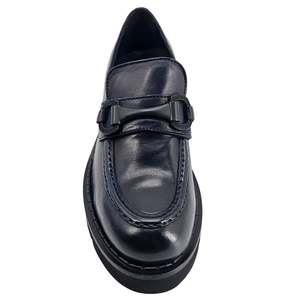 Elevate your style with this chunky lug sole loafer, a testament to Italian craftsmanship. Each pair is 100% handmade, with premium leather meticulously hand-dyed to achieve its rich, deep navy hue. Designed for both fashion and function, these loafers feature a sturdy lug sole that offers excellent grip and a comfortable lift. The unique rubber horse bit buckle adds a modern touch to this classic silhouette. Key Details: - Color: Dark Navy - Origin: Made in Italy - Craftsmanship: 100% handmade - Material: Hand-dyed leather - Heel height: 5 cm (approx. 2 inches) - Platform lift: 1.5 cm (approx. 0.6 inches) - Buckle: Rubber horse bit