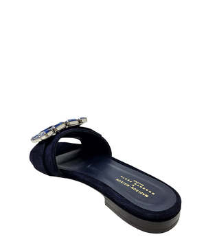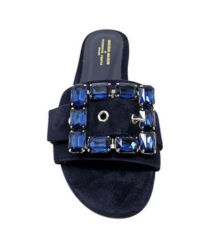 The Fade Jeweled Buckle Suede Sandal by Madison Maison features a jeweled buckle detail and a suede upper in a navy colorway.
