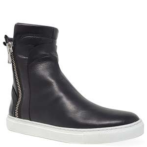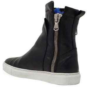The Black Leather Double Zip Shearling Sneaker by Madison Maison keeps you cozy and stylish with its luxurious shearling lining. This high-top sneaker features a 6.5 inch shaft and a sophisticated black design. It is made with leather and shearling lining and finished with a rubber sole. Perfect for cooler weather, this Italian-made shoe is a versatile addition to your wardrobe.
