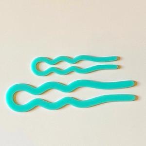 Hairpin in 6" Turquoise by Mae Mae. Mae Mae's signature acrylic hairpin in a smaller 6" size. Hairpin has wavy edges and is perfect to tie up a small pony or long bangs. 100% Acrylic plastic 6" in length.