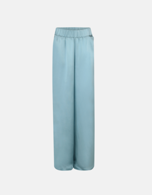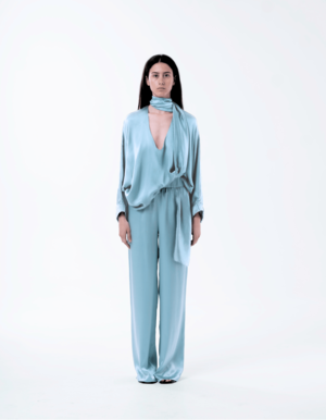 Flowy long-sleeved shirt in turquoise silk with a deep V neckline and draped scarf detail. Matching high-waisted, wide-leg trousers with a relaxed fit. Details: - Comfy 100% silk set - Scarf detail - Deep V neckline - High-waisted pants
