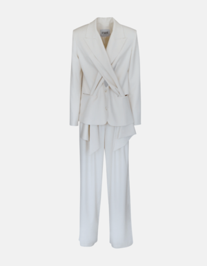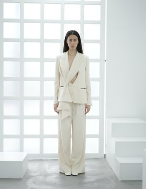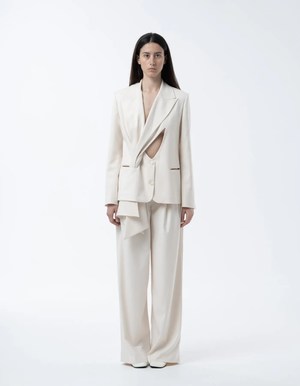 Medium-length jacket featuring cut-outs in the front with wrapped texture and regular fit pants with two folds on each side. Details: - Panna - Cut-out details in front - Long collar scarf shape - Regular pants with two folds on each side