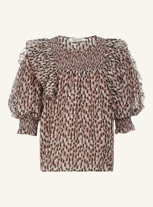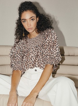 Crafted from a natural blend of cotton silk, the Petal Top by Magali Pascal is an effortless silhouette in an exclusive floral Brush Print. This top features elbow-length balloon sleeves with elasticated cuffs, ruched neck detail, and ruffled shoulders. 70% cotton, 30% silk with a 100% cotton lining. --- Sizing: The petal top fits true to size. Model is a size small and her measurements are: Height: 59 Bust: 32 Waist: 24 Hips: 35 Guide: XS = US 4 S = US 6 M = US 8 L = US 10 Care: Dry clean recommended. Do not spot clean. Do not tumble dry. Cool iron on the reverse side. Please be sure to avoid rubbings against rough surfaces and be careful when wearing any jewellery to avoid fabric pulling or tearing.
