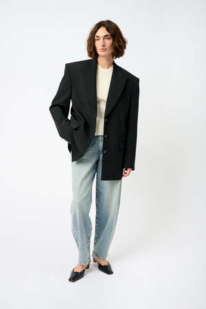 Magda Butrym's boxy blazer exemplifies the label's elegant romance. Woven in 100% wool and lined in silk, it has sharp shoulders, a notched collar, and a front button fastening, making it a perfect wardrobe staple. Shell: 100% wool. Lining: 100% silk. Details - Blazer - Satin - Silk and wool-blend - Shoulder pads - Buttoned cuffs - Front welt pockets - Button fastening at front - Fully lined - Mid-weight, non-stretchy fabric - Dry clean only.