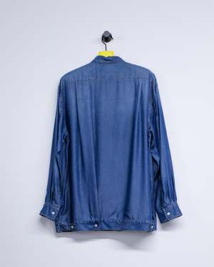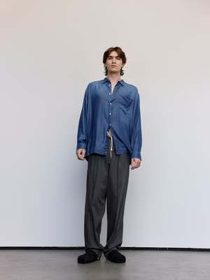 Lightweight lyocell shirt in a loose elongated fit. Detailed with adjustable button tabs to adjust the pleat. Features a non adjustable pressed rivet to create a cocoon shape on the back.