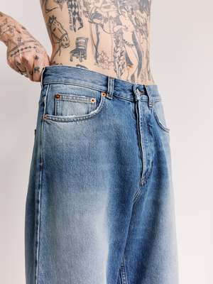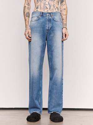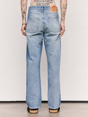 A medium weight denim in a straight leg cut. Featuring a 5-pocket design and button fly. Finished with subtle distressing on the edges and signature brand patch on the back. 100% Cotton.