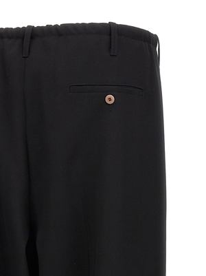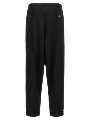 The "People's" wool pants feature a drawstring at the waist, slightly wide leg, pockets, and a turn-up hem. Composition: 100% virgin wool.