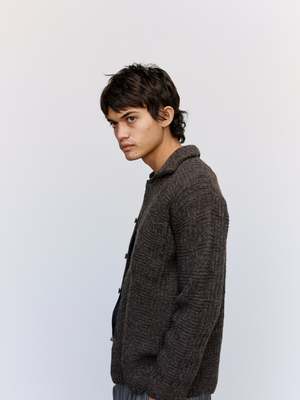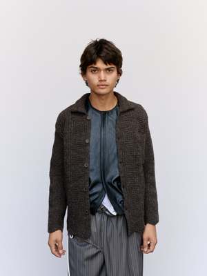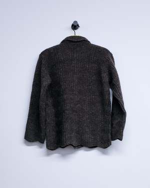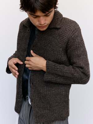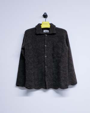 A Unique Knit, that sits somewhere between a cardigan and a shirt. Collared and Button Front with a Cropped Boxy Fit. Unique Square Pattern in a Lovely Shetland Wool that's soft in texture. Wool Model wears a Size