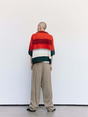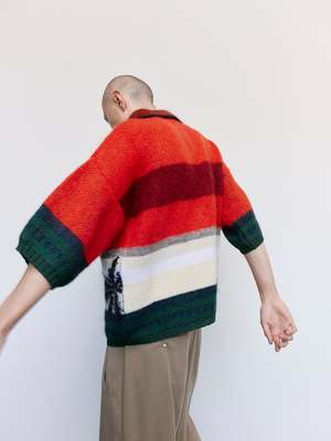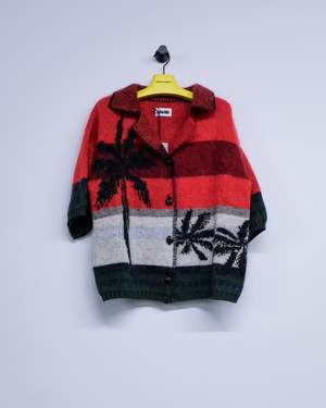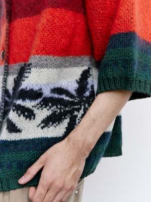 Short sleeved cardigan in a very soft heavy weight mohair. Detailed with leather buttons and a camp collar style. Finished with ribbings on the sleeve hem and bottom hem. Mohair blend Model wears a size M.