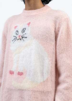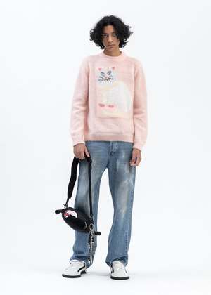Gattone knit sweater in pink, from Magliano. Relaxed panelled construction with slightly dropped shoulders, a knitted cat graphic across the front face, and rib-knit cuffs and collar. Relaxed Fit 50% Cashmere, 32% Polyamide, 18% Wool Made in Italy Model is wearing a size S Model is 6'1 (185cm), 159 pounds (72 kg), usually wears S in tops. A size 30 in denim and 46 trousers. Size 11 in shoes.