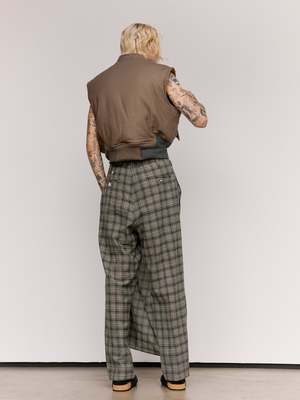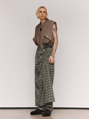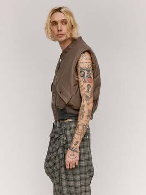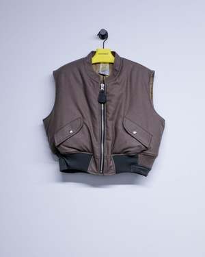 Heavy weight vest in a cut off bomber style featuring a boxy, slightly cropped fit. Featuring prominent asymmetrical ribbings at the hem and dual flap pockets. Detailed with a large branded pull tab. This vest can be worn inside out. Wool nylon blend Ian is 6'2" and wearing a size Small.