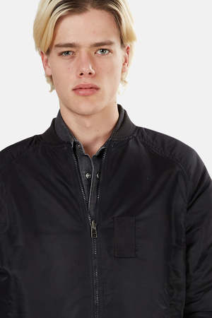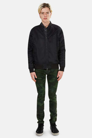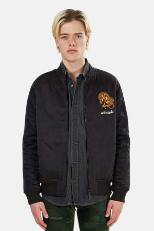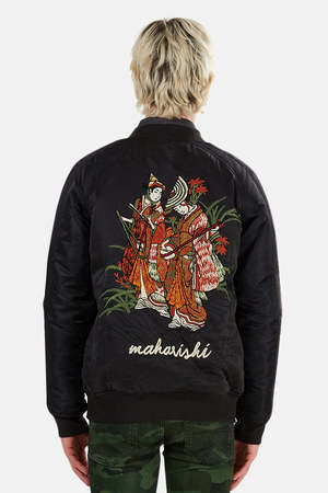 Reversible silk / nylon combo bomber with button snap closure. Handworked chest and back embroidery with Maharishi script. Secure front pockets, ribbed collar, cuffs and hem. Chest pocket internal or external depending on reverse side. - Color: Black - 100% Silk - 100% Nylon - Dry Clean Only * Model is 6'1" wearing size L Designer MAHARISHI