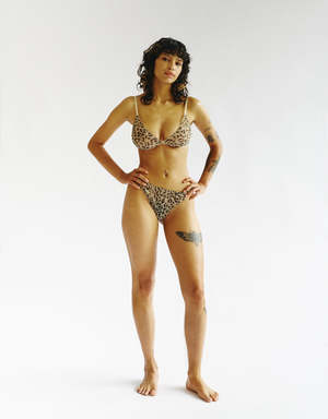 Classic silhouette top with clip on the cup, made with italian poliamide with exclusive print , adjustable straps, gold-plated accessories and three-position fastening. Model wears size S
