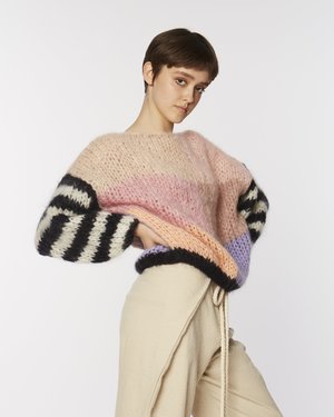 Maiami is a young knitwear label based in Berlin. We absolutely love this line of beautiful handmade & unique sweaters. The softest blend ever and then probably the best knit placement too. Hand knitted in a grey stitch with diverse motif. Just a little fuzzy and a looser knit. - Crewneck - Loose stitch - Dropped armholes - Bell sleeves - Rib knit at hem and cuffs - Relaxed fit - Designed and hand-knitted in Germany - 78% Mohair, 13% polyamide, 9% wool on both yarn qualities - Dry-clean only