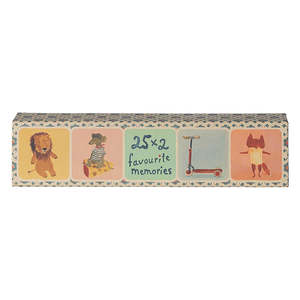 Maileg is a Danish brand creating well-made children's toys designed to encourage imaginative play and be passed down for generations. This classic memory game features 25 charming illustrations drawn by Dorthe Mailil. The set contains 50 cards and is recommended for ages 3 and up. Size: Miniature Dimensions: H 4.5 cm x W 30.5 cm x D 7.5 cm Care: Surface clean. Style/Code: 19-4002-00 Type: Game