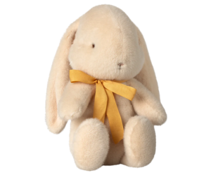 This bunny comes in very soft and unique plush fabric. It has a beautiful bow around the neck. It has a very sweet look and will soon be someone's very best friend.