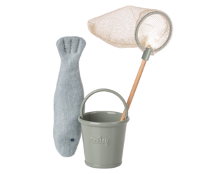 The fishing set is a great accessory for the mouse family to start a new play scene. The set includes a fishing net, fish, and a bucket to carry the catch home.