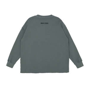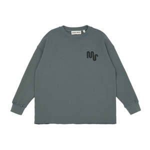 From Main Story UK. Long sleeve waffle tee with raw hem, black Main Story squiggle logo2, and relaxed cut. An ideal layering piece. - Unisex kid's shirt - Color: Pewter - 100% organic cotton - Long sleeves with banded cuffs - Crewneck - Dropped shoulders - Loose fit