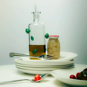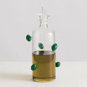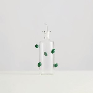 This olive oil bottle by Maison Balzac is generously studded with plump green olives, designed to bring a joyful touch to your table. Hand-blown glassware may feature slight variances in shape, size, and color, which are part of the charm of handmade products and do not affect functionality. Dimensions: Height 24cm, Width 7.4cm, Capacity Approx 550ml 100% Borosilicate Glass Imported Final Sale.