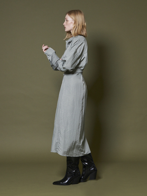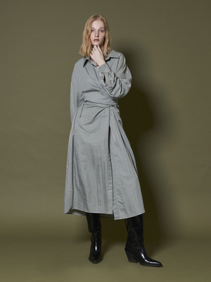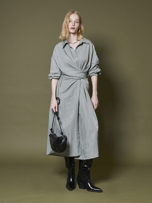 TIE WRAP SHIRTS DRESS (KHAKI GRAY) - Unique shirt dress that has wrap string details. - Naturally unbalanced design and a naturally draped silhouette. - Fabric is naturally subtly wrinkled to create a vintage mood. Available in one size. 100% nylon.