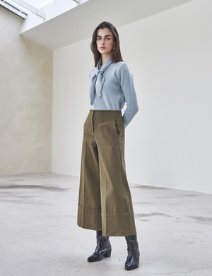 Oxford wide pants made out of heavyweight fabric. Has a high waist with hem cuff detail and back and side pockets. Available in two sizes: S, M. 96% Cotton, 4% Spandex.