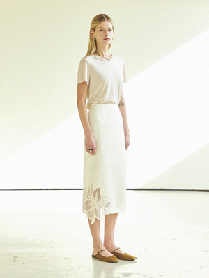 Sheer Flower Detail H-Skirt (Ivory) - H-line pencil skirt with a long length. - See-through flower embroidery detail at one side. - Silky, light material with a soft, cooling touch against the skin. - Slit at the back. - Back zipper opening. Available in two sizes: S, M Polyester 58%, Rayon 42%