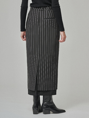 Striped pattern texture: Thin vertical stripes create a lengthening and slimming effect on the legs. Sheer hem layer: A lightweight organza-like sheer fabric at the hem adds a unique structural detail. H-line silhouette: A slim overall fit with a semi-straight line that flows naturally with movement. Long length: Falls below the knee for a polished yet stylish silhouette. Minimal waist design: Designed to maintain a clean line even when tops are tucked in. Available in two sizes: S, M. TENCEL 79%, RAYON 18%, SPANDEX 3%. Made in Korea. Dry cleaning only.