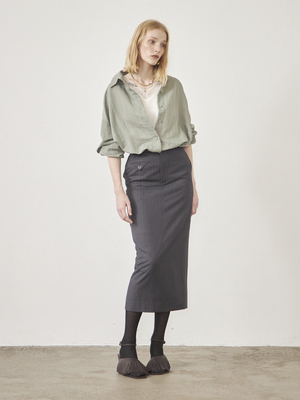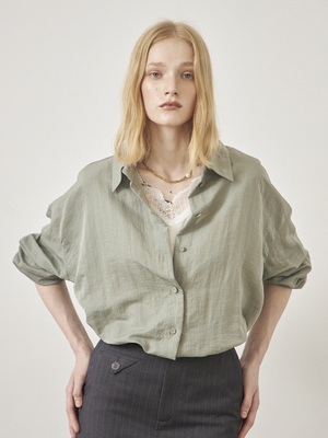 RELAXED OVERSIZED SHIRT (KHAKI GRAY) - Long sleeve shirt made out of unique nylon material. - Material has subtle sheen and doesnt crinkle. - Logo embroidery at the back neck. - Fabric covered button details. Available in one size. 100% nylon.