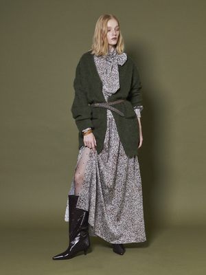 MOHAIR OVERSIZED CARDIGAN (KHAKI) - Overfit long v-neck mohair wool cardigan that is made with vintage, hairy material. - Cardigan is very light, but has great insulation. - Hidden pocket details. Available in one size. 43% recycled polyester, 5% wool, 36% nylon, 16% acrylic.